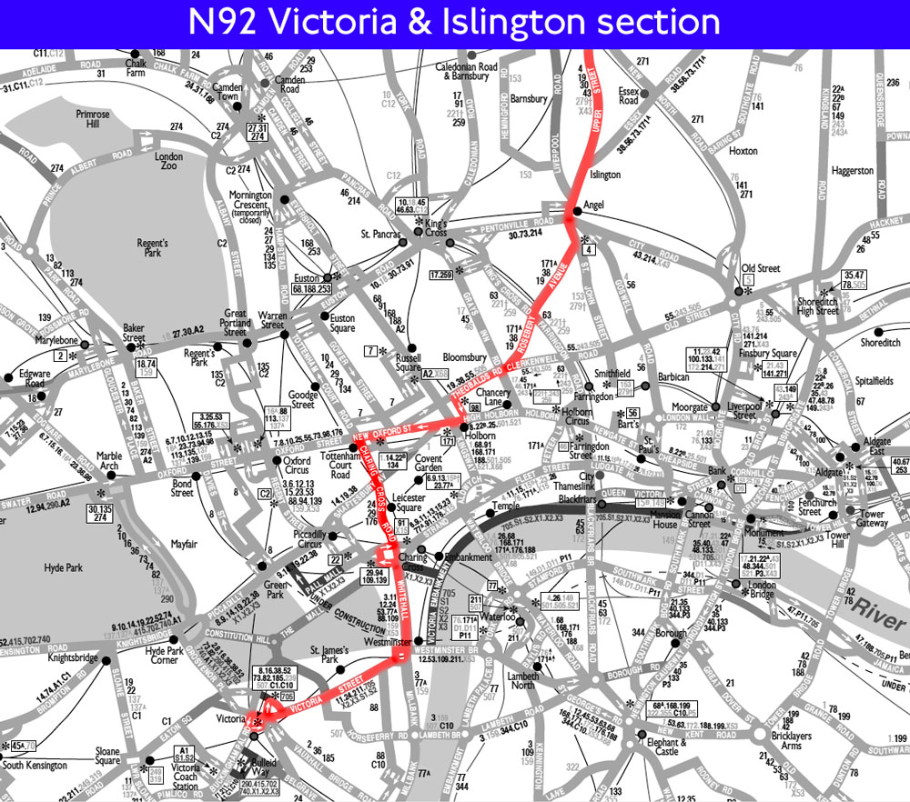 PIMLICO Grosvenor Road - Belgrave Road - Wilton Road - Victoria - Westminster - Trafalgar Square - Aldwych - Holborn - Rosebery Avenue - Angel - Upper Street - Highbury Corner- Holloway Road- Archway - Hornsey Rise - Crouch End - MUSWELL HILL BROADWAY ( Nightly )