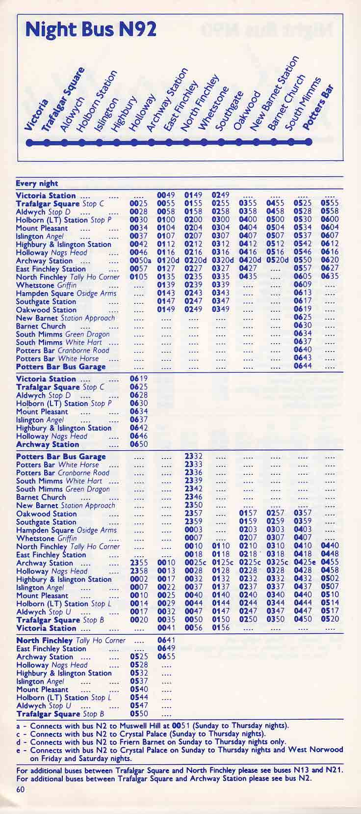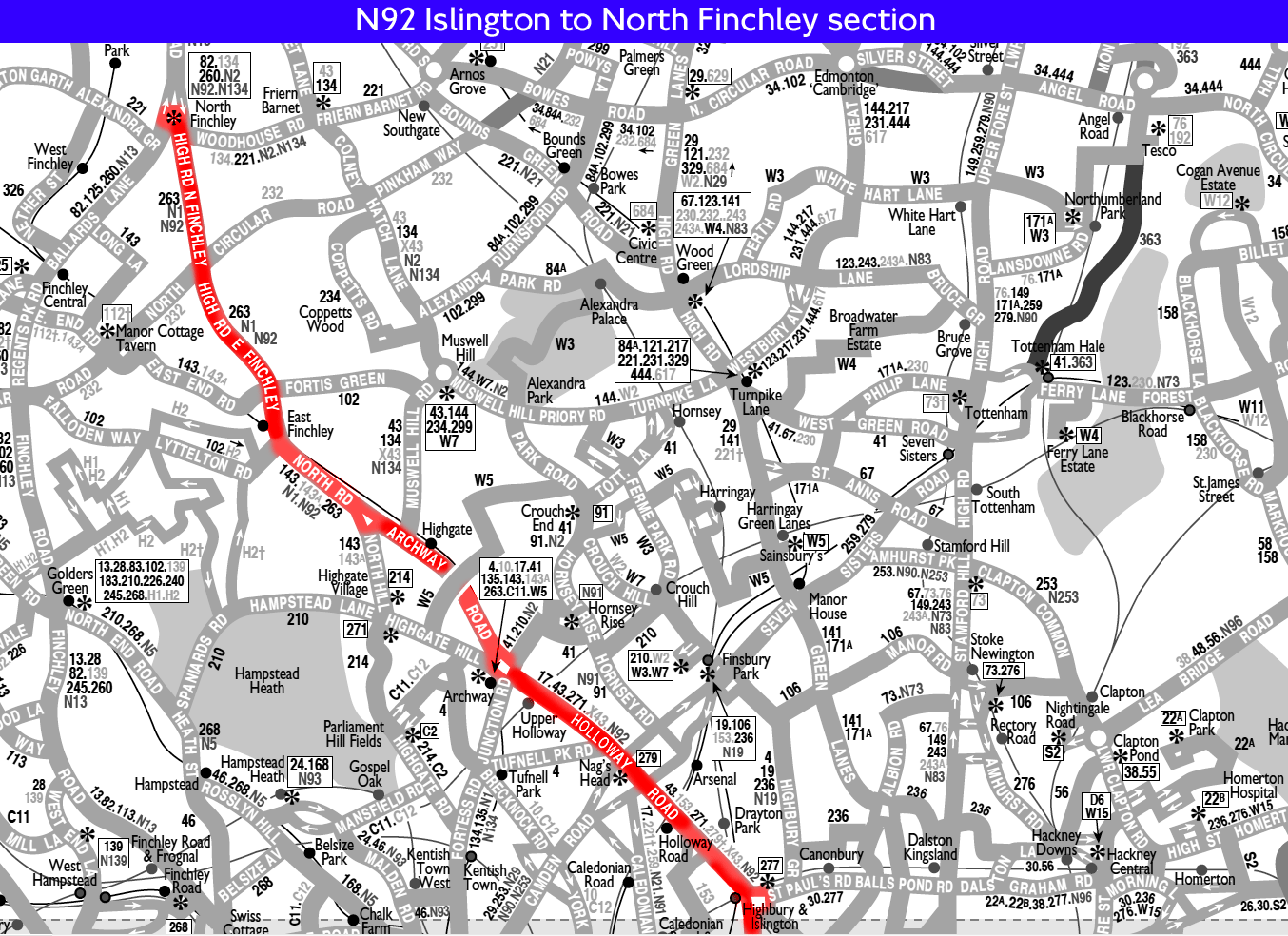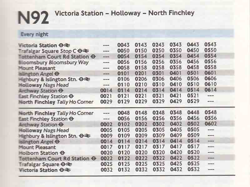 VICTORIA - Trafalgar Square - Cambridge Circus - Tottenham Court Road Stn - Bloomsbury - Theobalds Road - Rosebery Avenue - Islington High Street - Highbury Corner- Holloway Road - Archway - Highgate Stn - East Finchley - NORTH FINCHLEY ( Nightly )