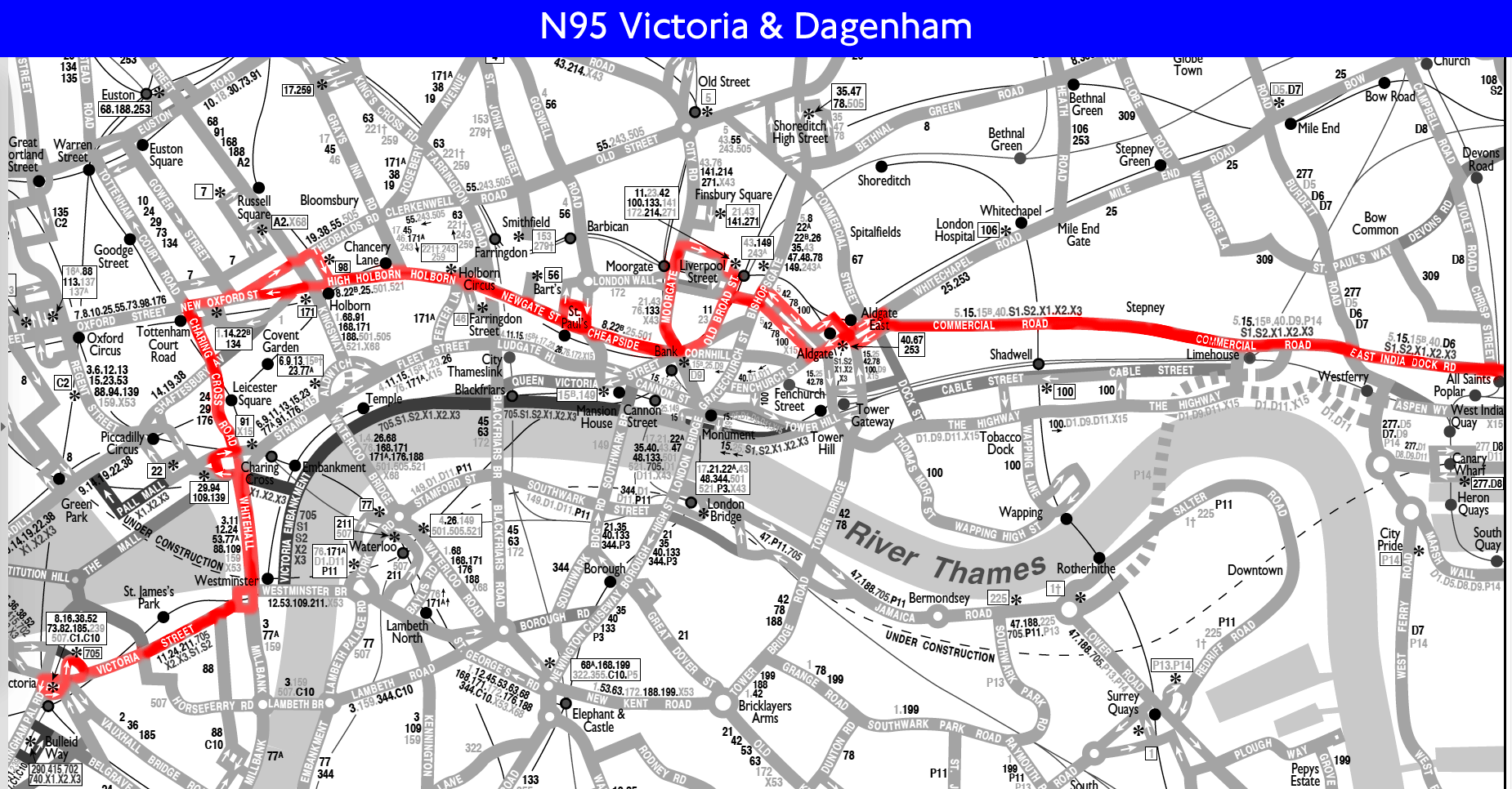 Rerouted between Aldgate East and Liverpool Street via Hounsditch instead of Commercial Street