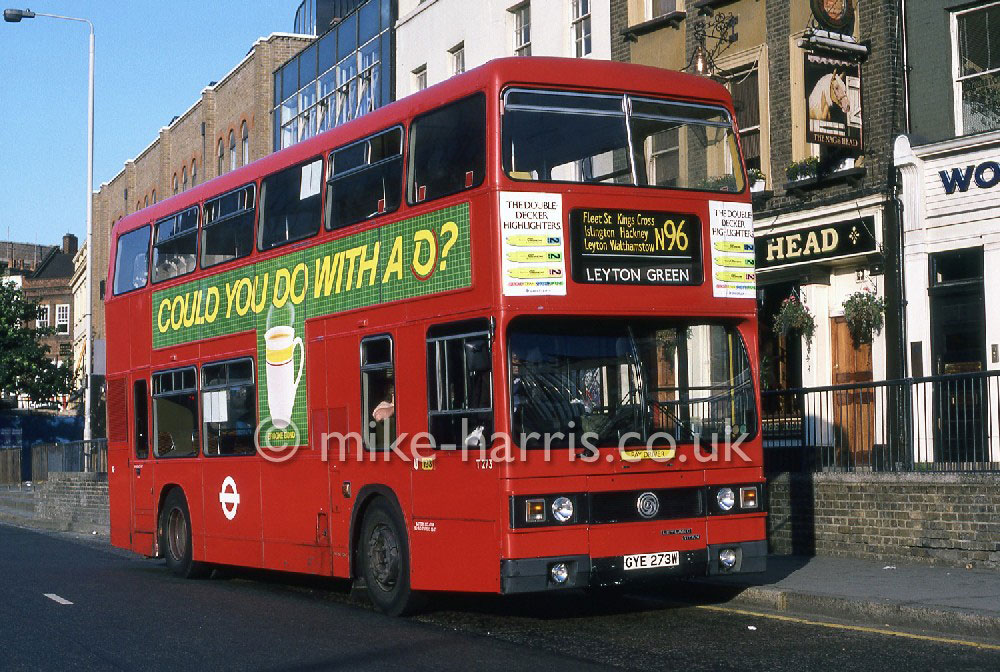 T273 recently transferred from Upton Park (U) to Leyton (T) is seen at Islington High Street on 4th July 1987 |