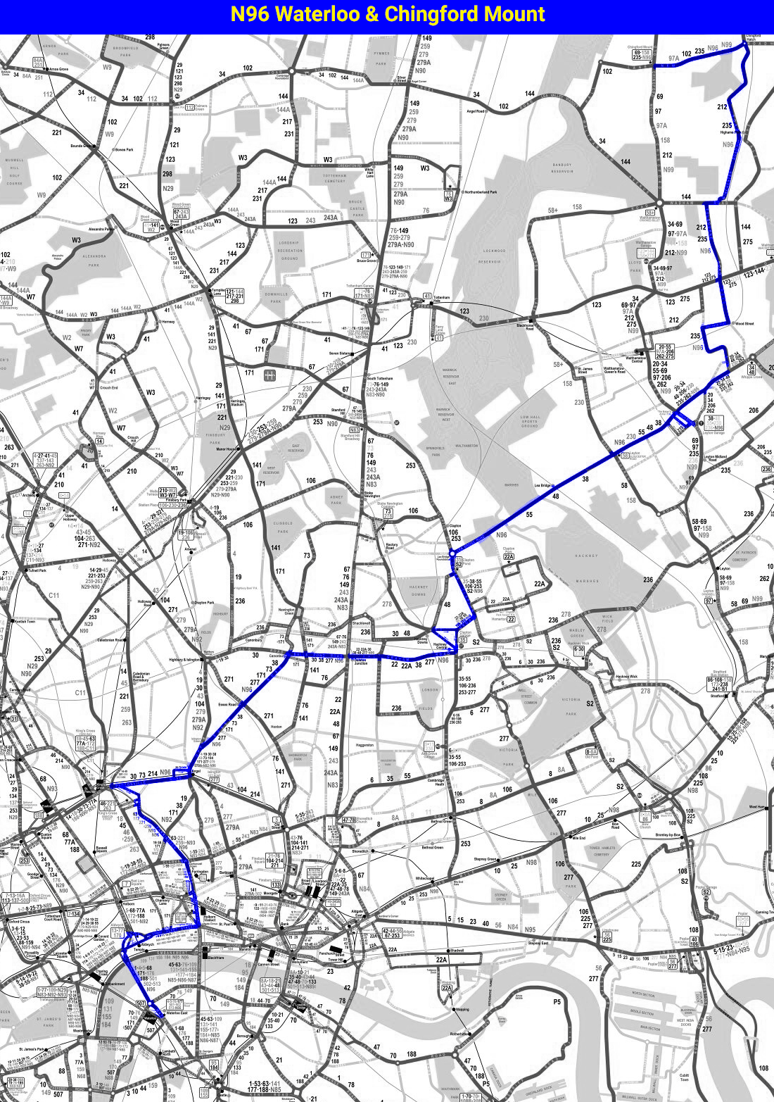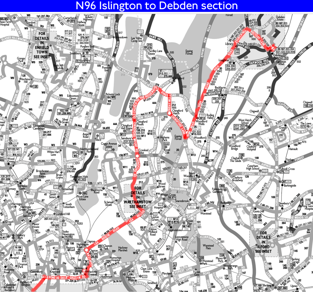 TRAFALGAR SQUARE - Piccadilly Circus - Shaftesbury Avenue - Tottenham Court Rd Stn - Bloomsbury - Mount Pleasant - Kings Cross - Leyton - Hoe Street - Walthamstow Central- Crooked Billet - Chingford Mount -The Ridgeway - Chingford - CHINGFORD STATION or Whitehall Road - Woodford Wells - Loughton - LOUGHTON STATION ( one journey ) - Rectory Road - DEBDEN STATION