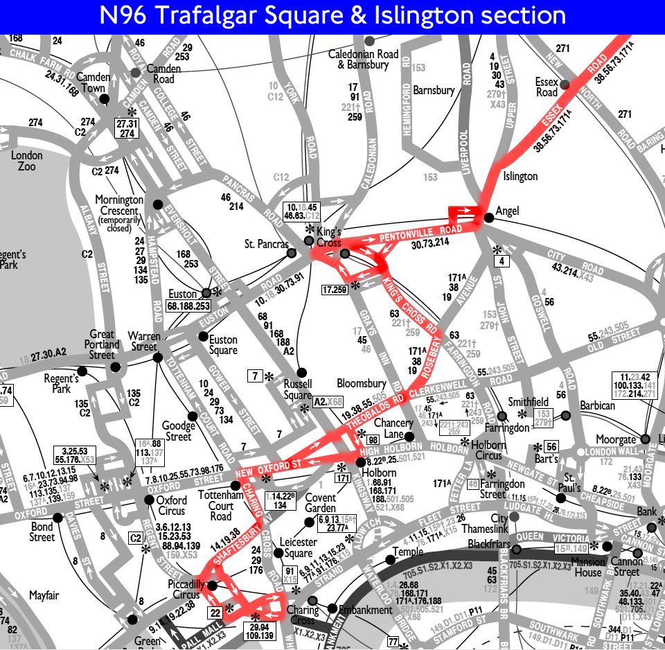 Revised to operate via Piccadilly Circus - Route 38 to Mount Pleasant - then as before via Kings Cross to Chingford and Debden