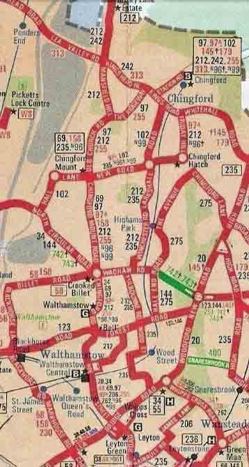 Diverted at Bakers Arms to run via Route 97A to Chingford Station instead of via Aims Park to Chingford Mount ( see map below )