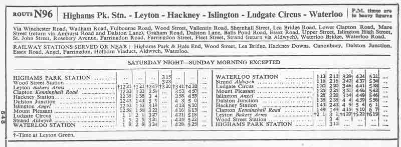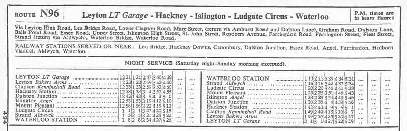This Route was previously numbered 296 but was part of a scheme to renumber all night routes in the "N" series to make available the numbers for the trolleybus replacement routes although this number remained vacant until 1975 and was used for a local route in the Wandsworth area