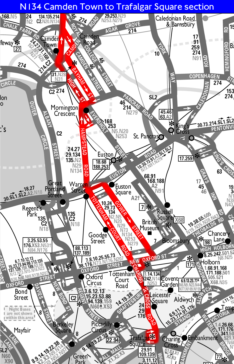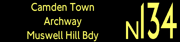 NORTH FINCHLEY - Friern Barnet - Colney Hatch Lane - Muswell Hill - Archway - Kentish Town - Camden Town - Warren Street Stn - Tottenham Court Road - Charing Cross Road -