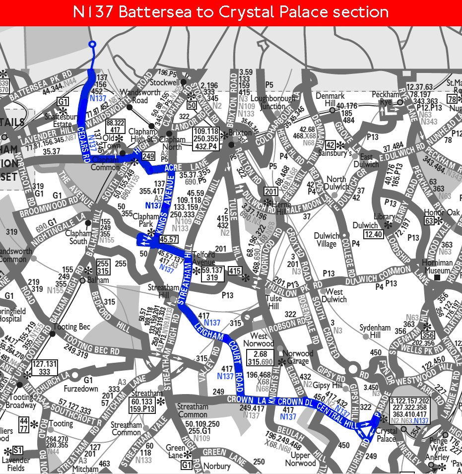 OXFORD CIRCUS John Princes Street - Oxford Street - - Marble Arch - Park Lane - Hyde Park Corner- Knightsbridge - Sloane Street - Lower Sloane Street - Chelsea Bridge Road - Chelsea Bridge - Queenstown Road - Queen's Circus - Battersea Park Station - Queenstown Road - Cedars Road - Clapham Common North Side - The Pavement - Clapham Common Station - Clapham Park Road - King's Avenue - Atkins Road - Streatham Place - Streatham Hill Station - Leigham Court Road - Crown Lane - Norwood - Crown Dale - Central Hill - Westow Hill - CRYSTAL PALACE