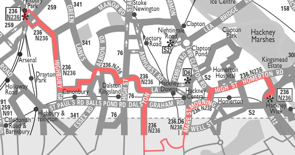 (West Side) - Newington Green (North Side) - Matthias Road - Boleyn Road - Crossway - Shacklewell Lane - Downs Park Road - St Mark's Rise - Ridley Road - Dalston Lane - Queensbridge Road - Pownall Road - Brougham Road - Trederwen Road - Lansdowne Drive - Westgate Street - The Triangle - Mare Street - Morning Lane - Ponsford Street - Homerton High Street - Fenn Street - Homerton Row - Homerton Grove - Wardle Street - Homerton High Street - Marsh Hill - Homerton Road - Lee Conservancy Road - HACKNEY WICK