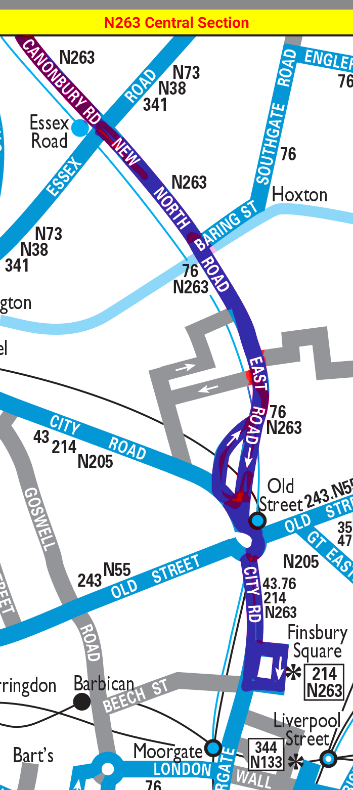 FINSBURY SQUARE - Old St Stn - Hoxton - New North Road - Canonbury - Highbury Corner - ~Holloway Road - Archway ~ Highate Village - North Hill - East Finchley Stn - High Road - NORTH FINCHLEY