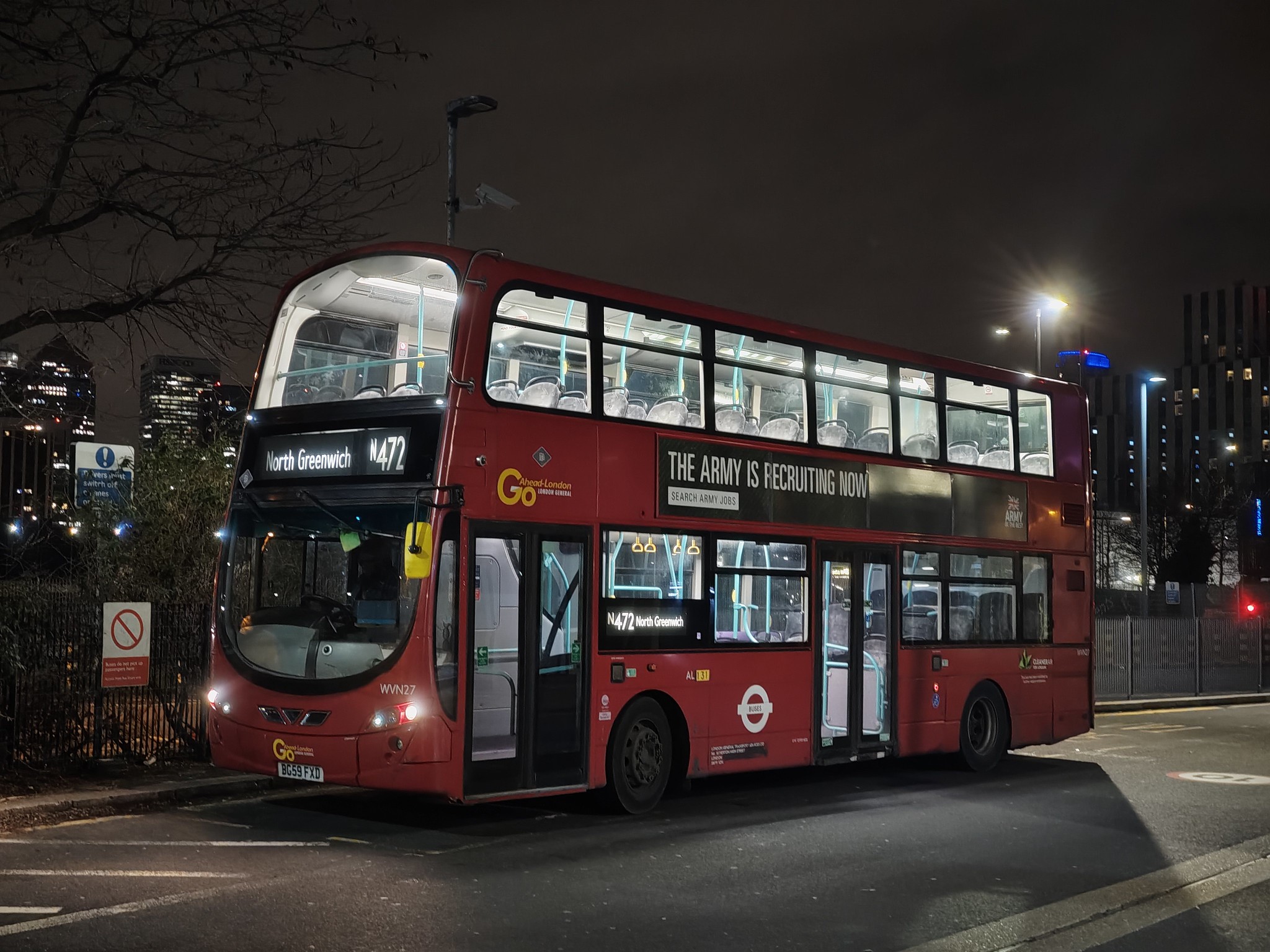 WVN27 waits at the North Greenwich stand on the first night of operation. The LT type was not ready for the start of this service © Aubrey |