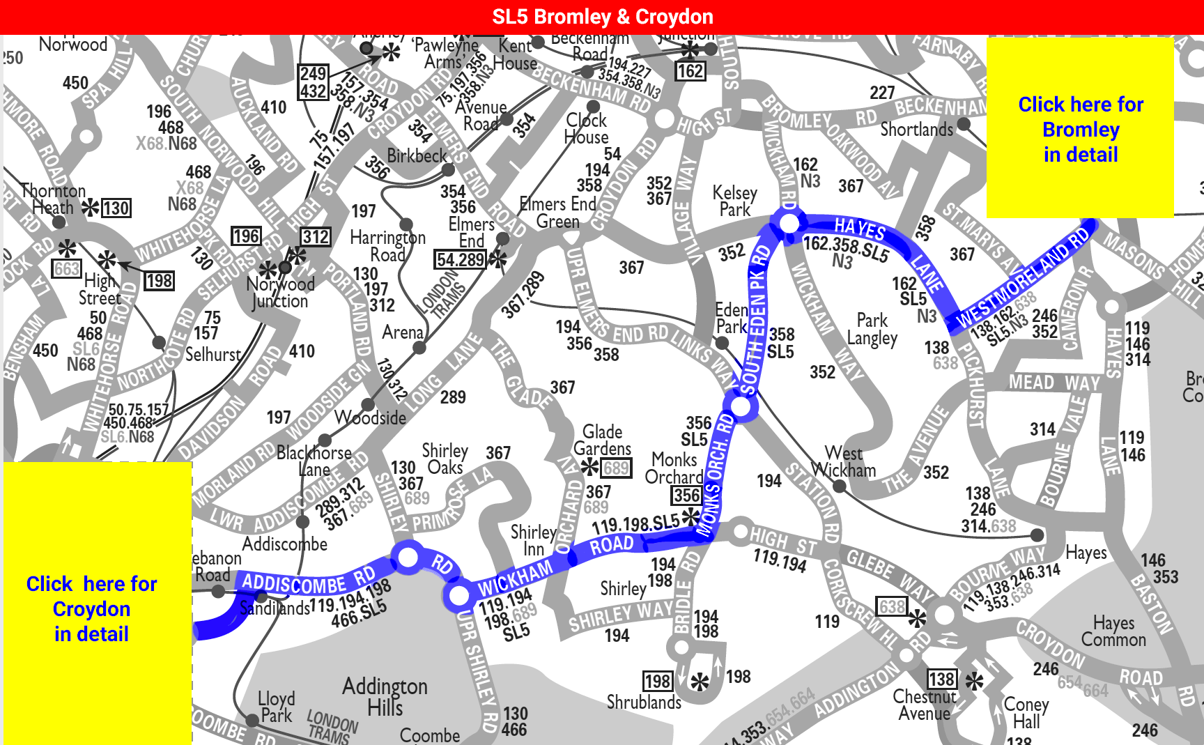 Bromley North Station - Tweedy Road - Kentish Way - Elmfield Road - High Street - Bromley South Station - Westmoreland Road - Hayes Lane - Park Langley - South Eden Park Road (for Eden Park Station) - Monks Orchard Road - Shirley - Wickham Road - Shirley Road - Addiscombe Road - East Croydon Station and Tramlink - George Street - Park Street - Croydon Park Street