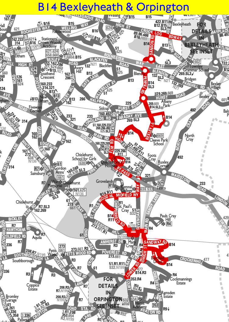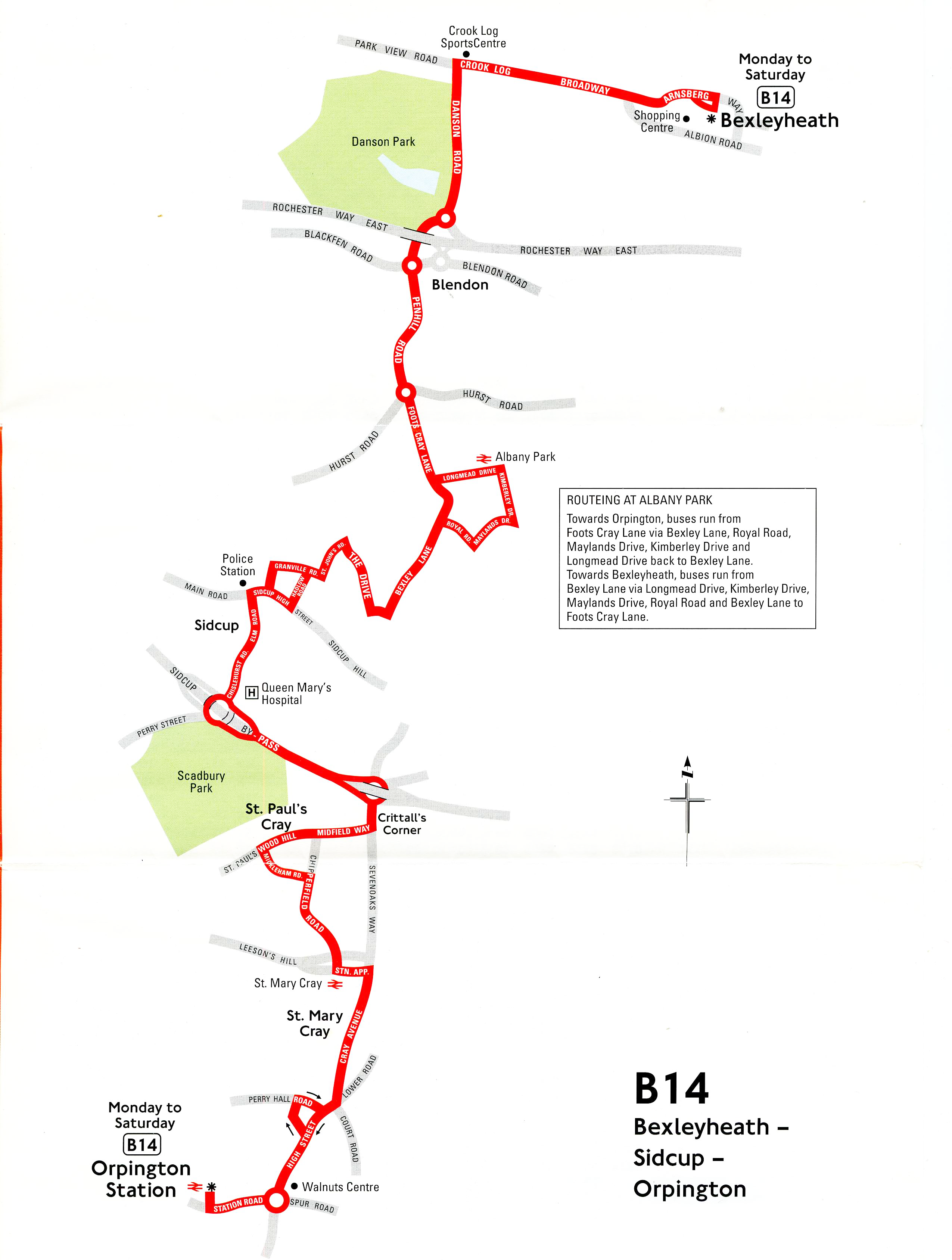 Route restructured to terminate at Bexleyheath, Townley Road. Introduction of new schedule - It is proposed to Operate a schoolday only journey on the B14. In the morning the additional journey would depart Bexleyheath shopping centre at 0737 with the last stop being Stop E Foots Cray Lane / Hurst Road. In the afternoon the additional journey would start at Stop P Foots Cray Lane / Hurst Road at 1500, which is 3 minutes after the current scheduled 1457 bus that departs Orpington station at 1406