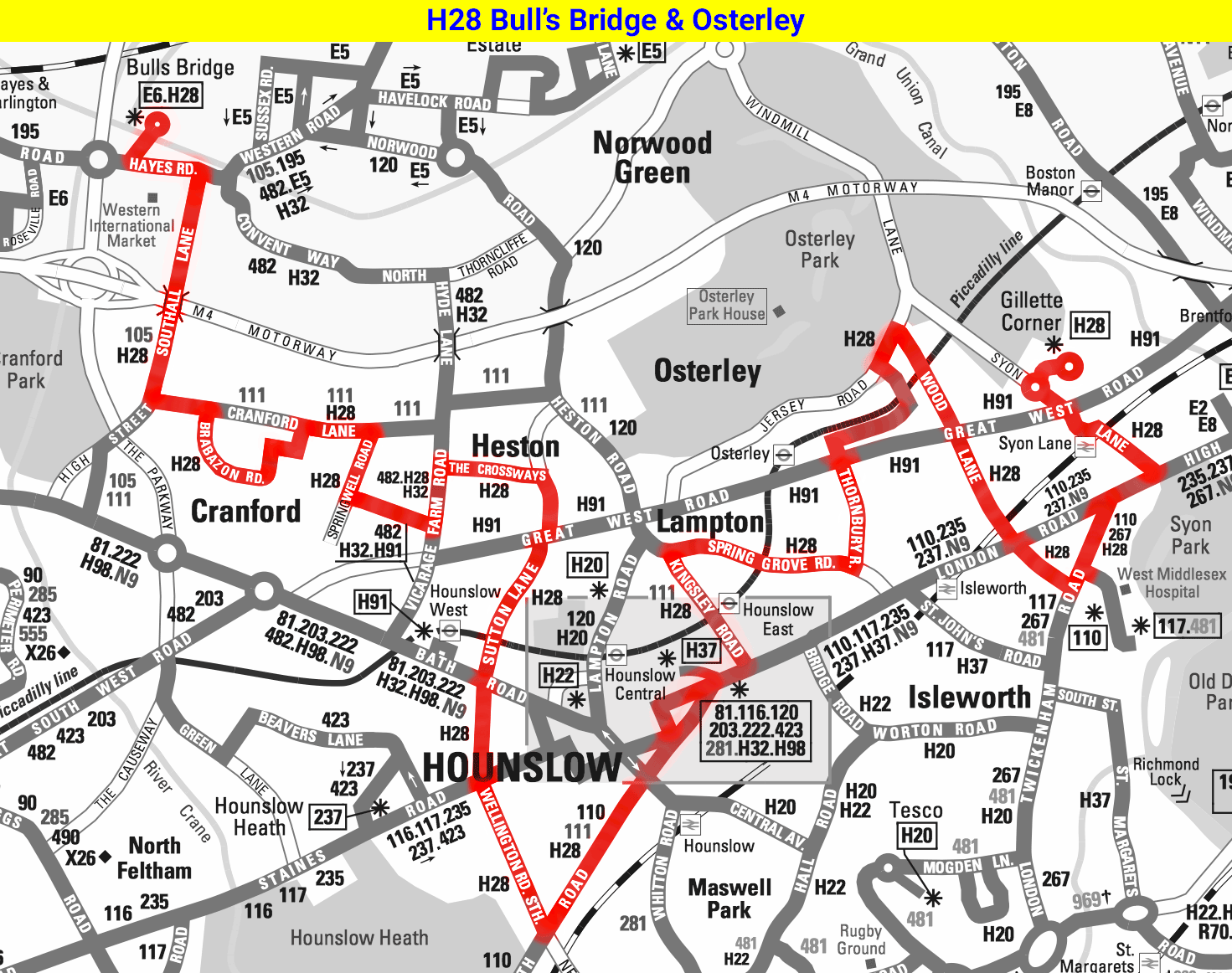 OSTERLEY Tesco - Syon Lane - Twickenham Road - Amhurst Gardens - London Road - Wood Lane - Jersey Road - Ridgeway Road North - St Mary's Crescent - Thornbury Road - Spring Grove Road - Kingsley Road - Hounslow Garage - Hounslow High Street - Hanworth Road - Wellington Road South - Wellington Road North - Sutton Lane - The Crossways - Vicarage Farm Road - Summerhouse Avenue - Springwell Road - Cranford Lane - Cranford High Street - Southall Lane - Hayes Road - BULLS BRIDGE Tesco ( Mon-Sat )