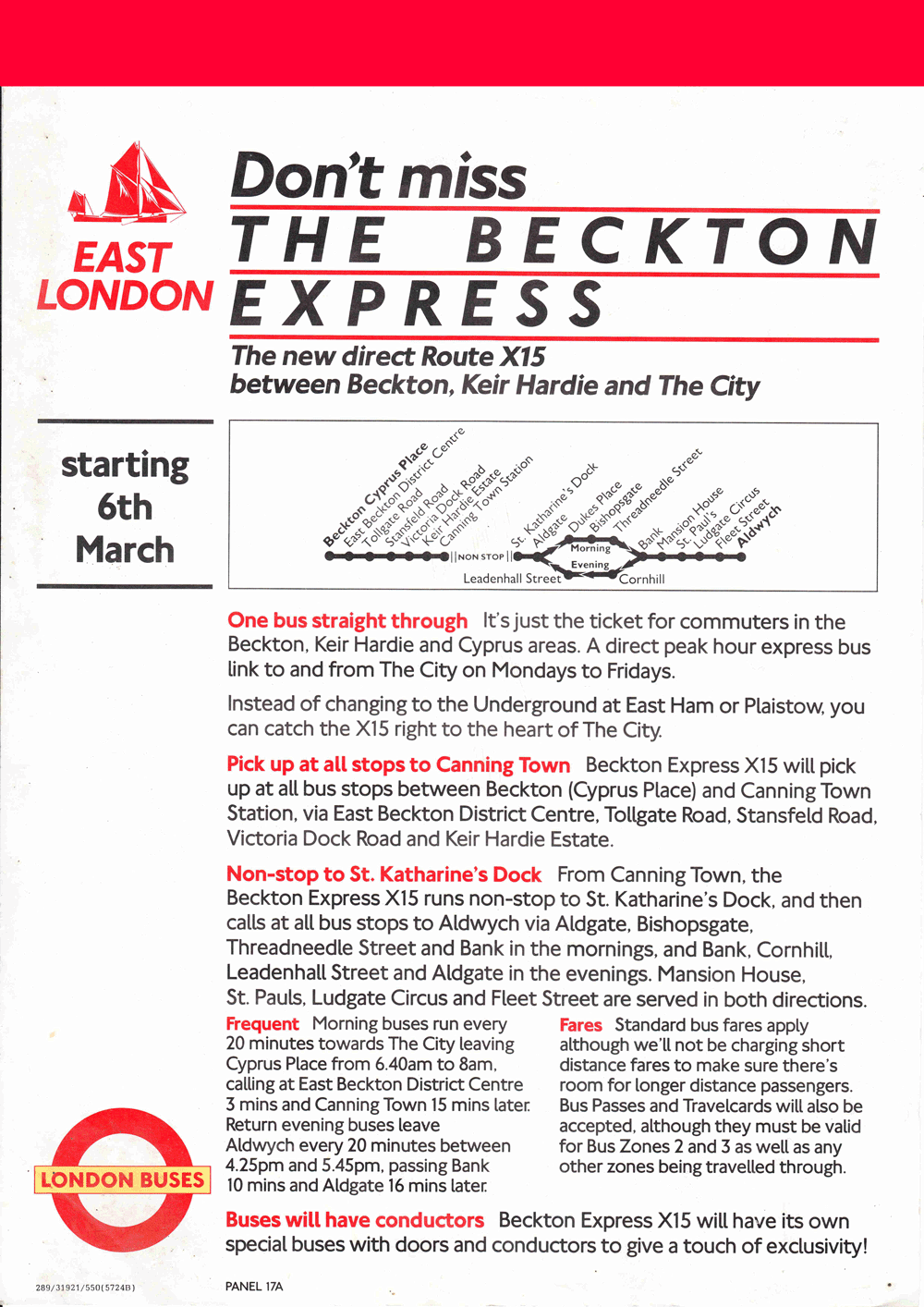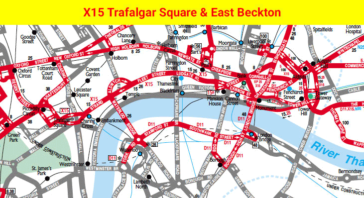 EAST BECKTON Cyprus ( Mon-Fri peaks / Sat shopping hours ) - TRAFALGAR SQUARE ( Mon-Fri pm peaks ) - OXFORD CIRCUS ( Mon-Fri am peaks/ Sat shopping hours)