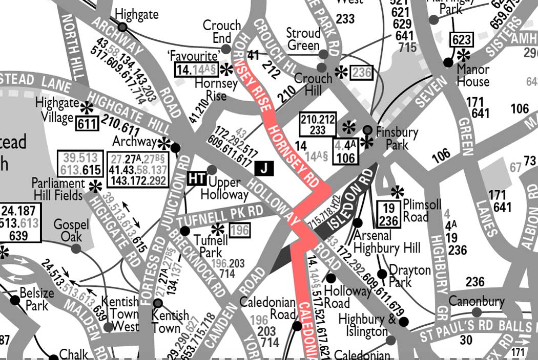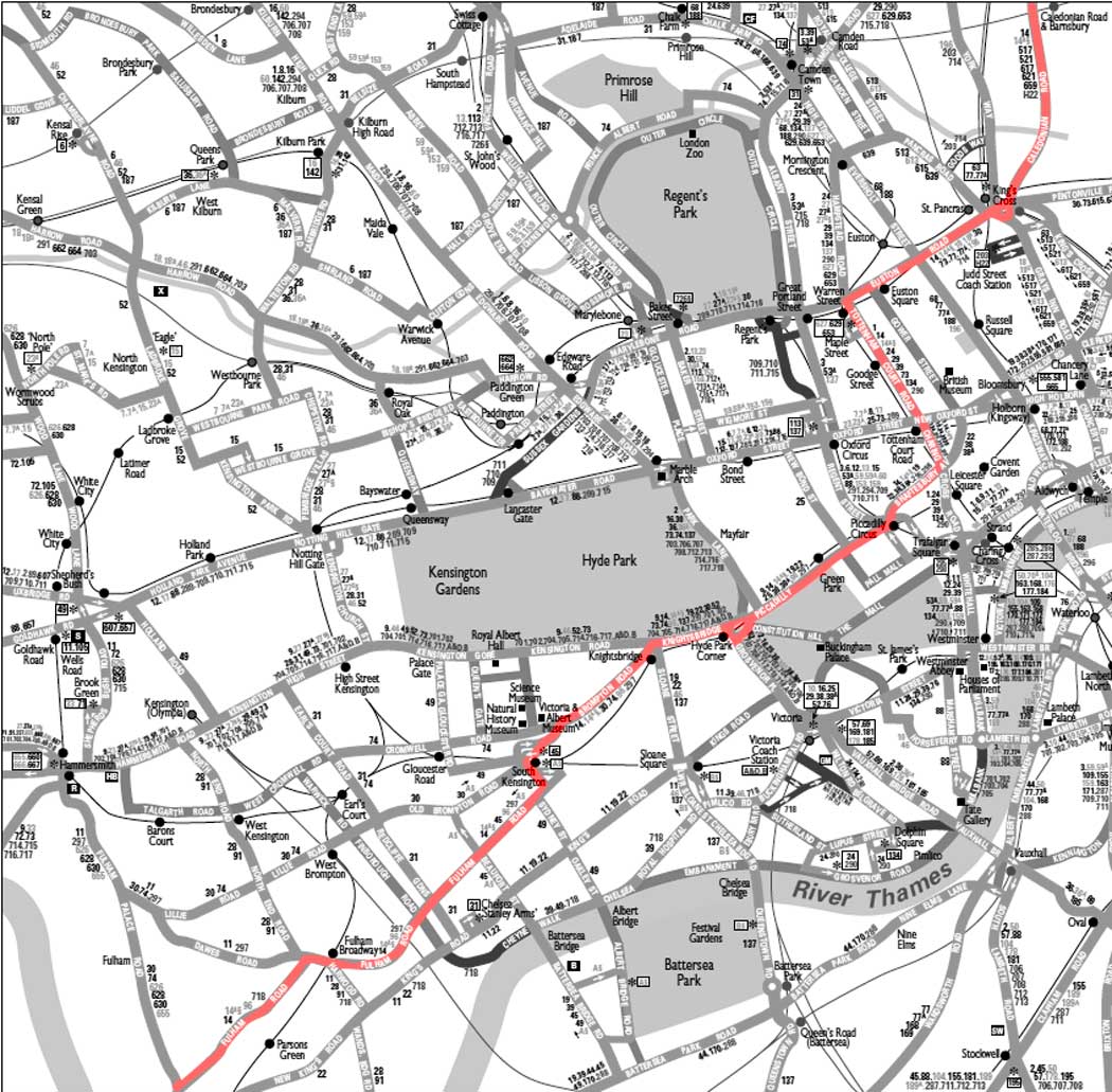 HORNSEY RISE - Hollloway - Caledonian Road - Kings † - Euston - Tottenham Court Road - Piccadilly - South Kensington - Fulham Road - Putney - Putney Heath - Roehampton - Kingston Vale - Kingston Hill - Kingston - HAMPTON COURT Vrow Walk ( Sat pm / Suns )