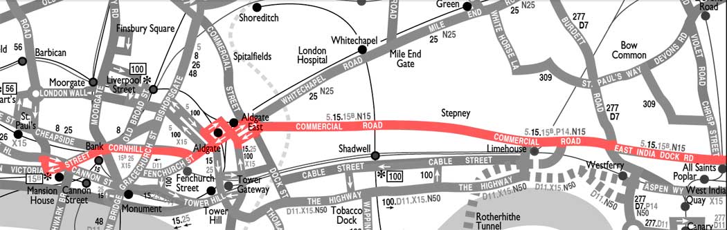 EAST HAM White Horse - Upton Park - Plaistow - Canning Town - Poplar - Limehouse - Stepney - Aldgate - Bank - St Paul's - Ludgate Circus - Aldwych - Trafalgar Square - Piccadilly Circus - OXFORD CIRCUS (Mon-Fri except evenings)