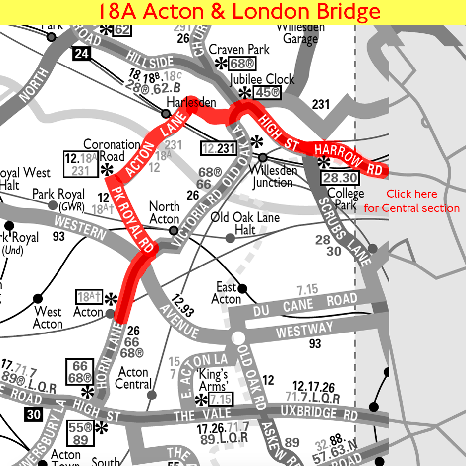 LONDON BRIDGE STATION - Southwark Bridge - Ludgate Circus - Holborn Circus - Grays Inn Road - Kings Cross - Euston - Marylebone Road - Baker Street Station - Paddington Green - Harrow Road - Kensal Green - Harlesden Station - PARK ROYAL Coronation Road ( Mon-Sat ) - Gipsy Corner - ACTON GWR Station ( Mon-Sat peak hours )