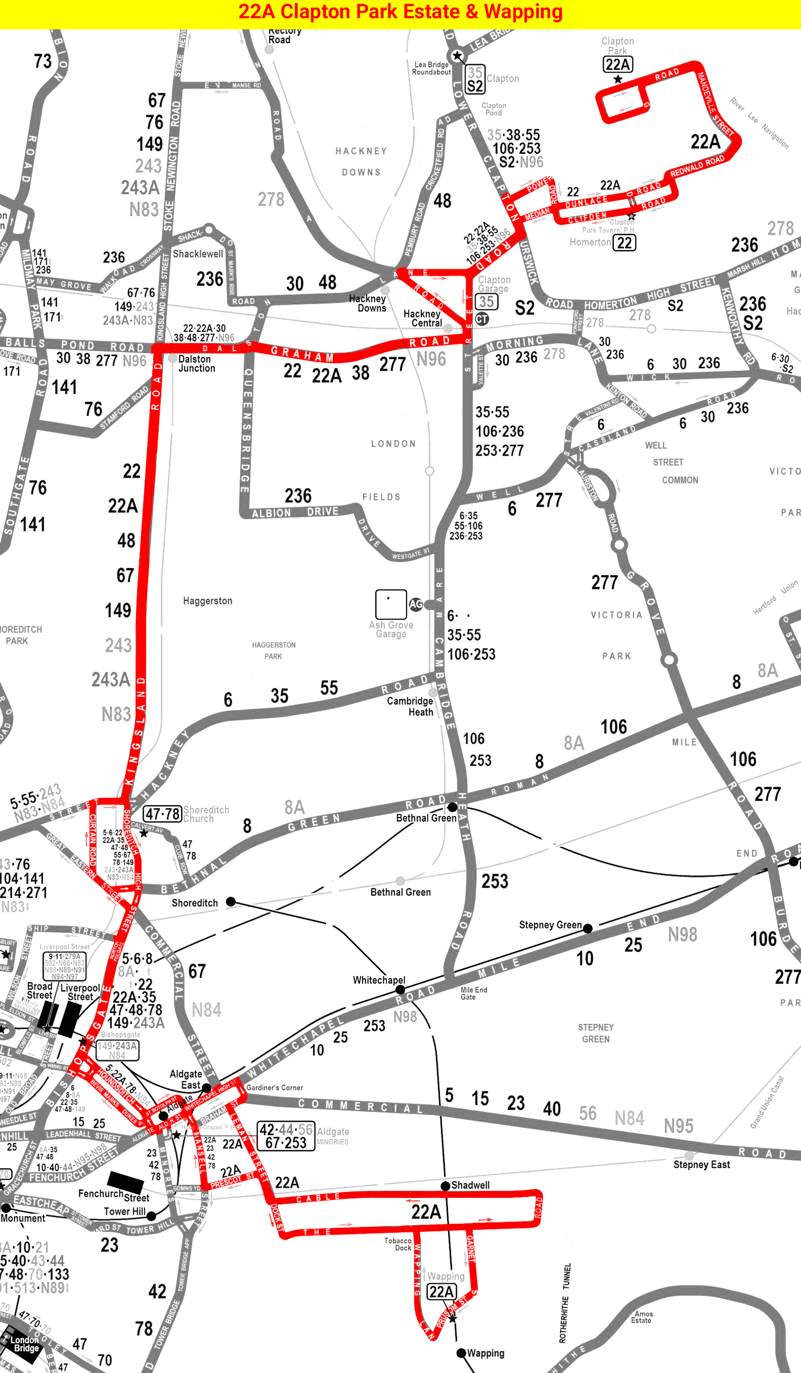 - Hounsditch - Aldgate - Leman Street - Cable Street - The Highway - Wapping Lane - WAPPING STATION (Suns)