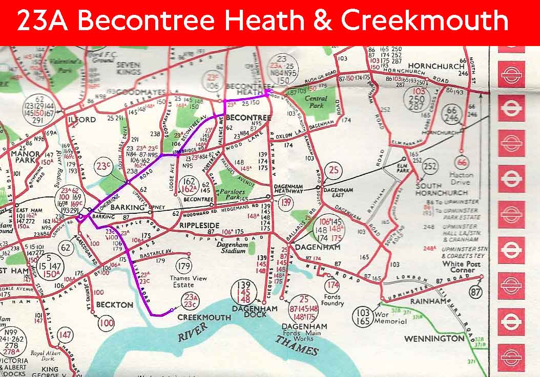 BECONTREE Chittys Lane - Bennetts Castle Lane - (return via Valence Avenue & Green Lane) Becontree Avenue - Longbridge Road - BARKING Blakes Corner (Suns) Ripple Road - Movers Lane - River Road - CREEKMOUTH Power Station (Sun jnys)
