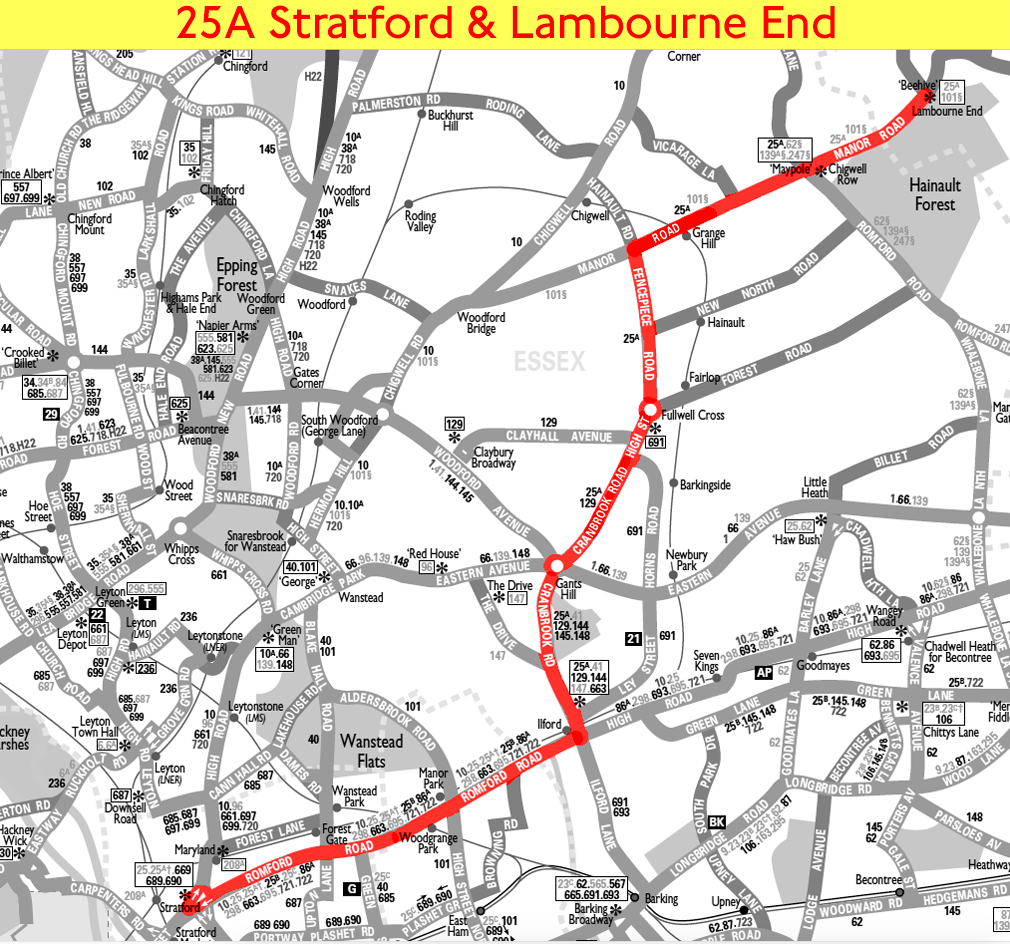 STRATFORD BROADWAY ( Sun early am journeys ) - ILFORD - CHIGWELL ROW Maypole Inn ( DAILY ) - LAMBOURNE END ( Mon-Sat journeys )
