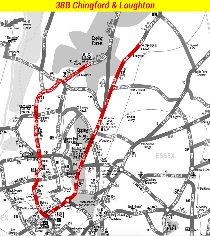 CHINGFORD Royal Forest Hotel - Old Church Road - Chingford Mount - Crooked Billet - Hoe Street - Bakers Arms - Whipps Cross - Woodford Green - LOUGHTON Crown ( Mon-Fri )