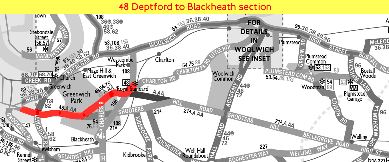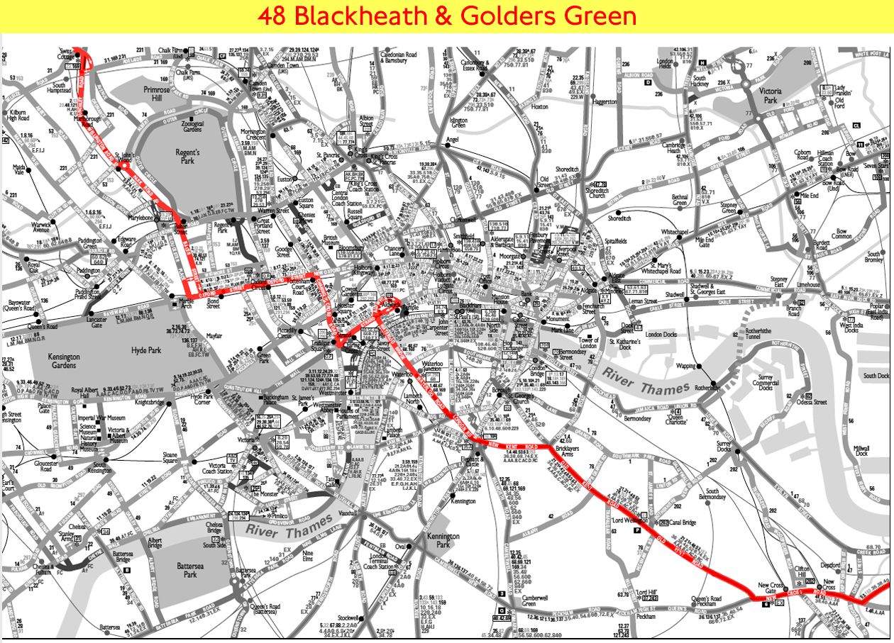 BLACKHEATH Royal Standard - Deptford - New Cross Gate - Old Kent Road - Bricklayer's Arms - Elephant - Waterloo - Aldwych - Strand - Trafalgar Square - Charing Cross Road - Oxford Street - Baker Street - Park Road - Swiss Cottage - FINCHLEY ROAD Met Stn ( Mon-Sat am ) - Finchley Road - GOLDERS GREEN STN (Mon-Sat pm / Sun )