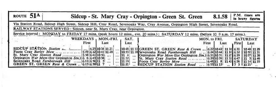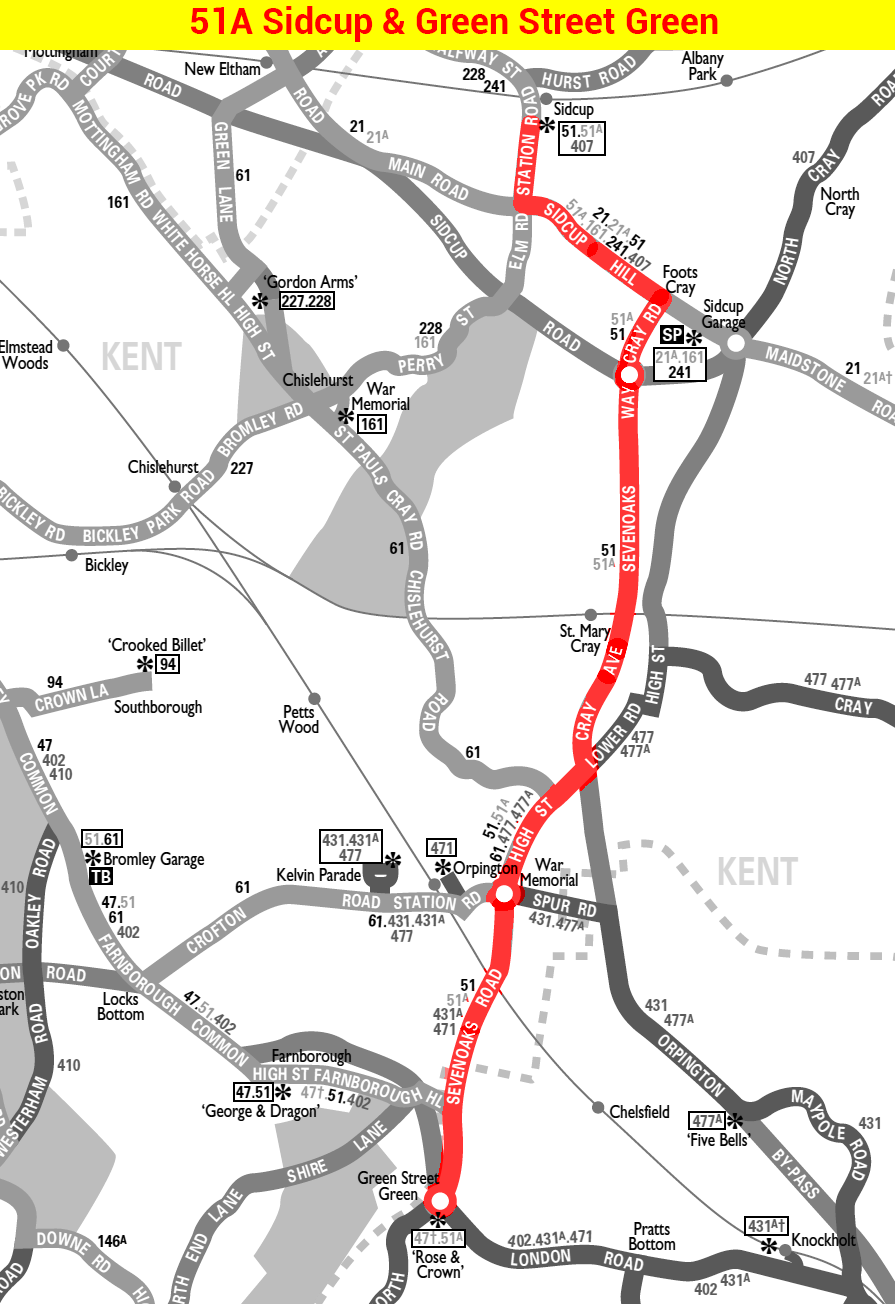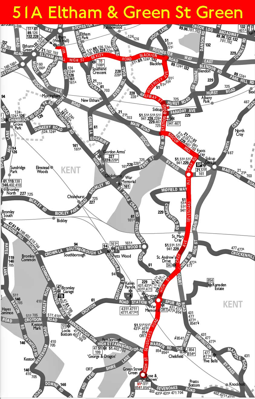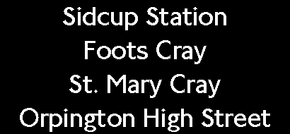 ELTHAM Well Hall Station (Mon-Fri except evenings) - Eltham High Street - Blackfen - SIDCUP STATION (Mon-Fri evenings) Sidcup - Foots Cray - St Mary Cray - Orpington - GREEN STREET GREEN Rose & Crown (Mon-Fri)