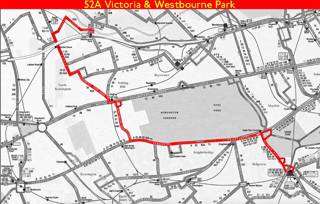 Hyde Park Corner - Knightsbridge - Kensington - Notting Hill Gate - Ladbroke Grove - Kensal Road - Elkstone Road - WESTBOURNE PARK STATION