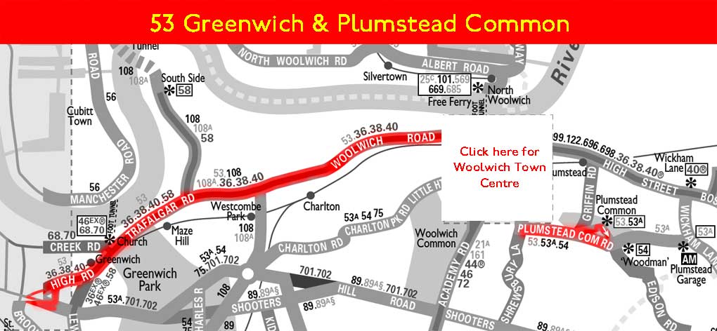 WEST HAMPSTEAD West End Green (Mon-Sat except evenings/ Suns)- WOOLWICH ( Sat evgs ) - PLUMSTEAD COMMON ( Mon-Fri except evgs/ Sat / Sun am) - BOSTALL WOODS Plumstead Garage ( Sun pm)