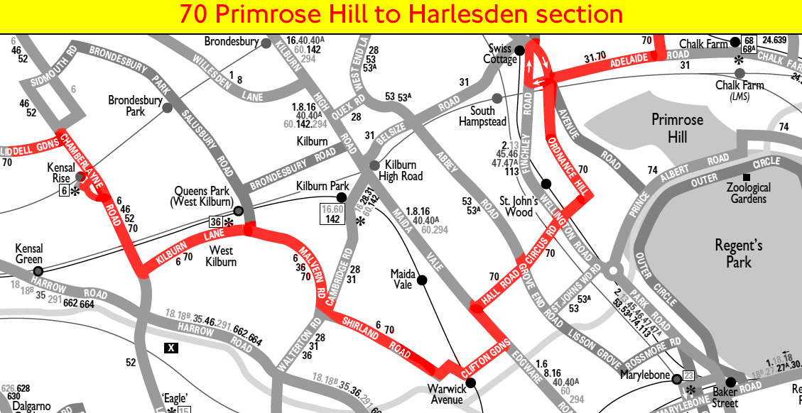 HAMPSTEAD HEATH South End Green - Englands Lane - Swiss Cottage - Ordnance Hill - Hall Road - Clifton Gardens - Warwick Avenue - Shirland Road - Malvern Road - West Kilburn - Kensal Rise - Liddell Gardens - Harlesden - Acton Lane - Chase Road - North Acton - ACTON GWR STN ( Mon-Fri ) - Acton - Gunnersbury Lane - Gunnersbury Avenue - Kew Bridge -