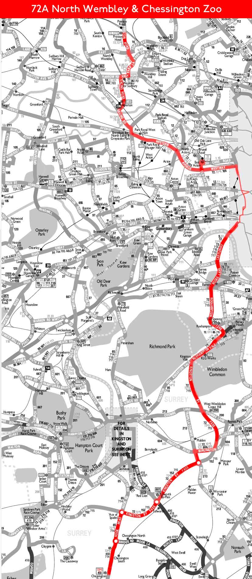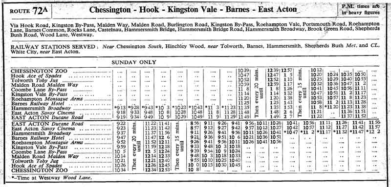 NORTH WEMBLEY Preston Road ( Suns ) - Wembley Central - Alperton - Hanger Lane - Park Royal Station - EAST ACTON ( Sats pm ) - Westway - White City - Shepherds Bush - Hammersmith - Castelnau - Barnes Common - Roehampton - Kingston By Pass - New Malden - Tolworth - Hook - CHESSINGTON ZOO ( Sat pm / Sundays )