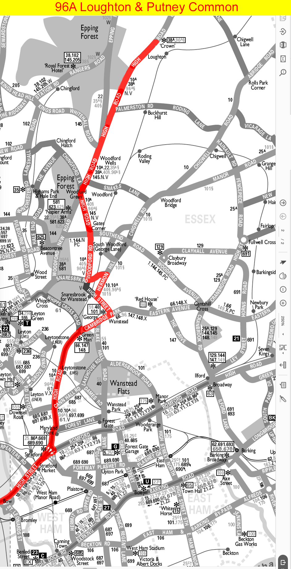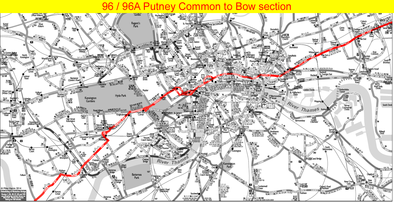 PUTNEY COMMON Cricketers - Putney Bridge - Fulham Road - Walham Green - South Kensington - Brompton Road - Piccadilly - Charing Cross - Fleet Street - Bank - Aldgate - Bow - Stratford - Leytonstone High Road - Wanstead - Snaresbrook - Woodford - Buckhurst Hill - LOUGHTON Crown ( Summer Sats )