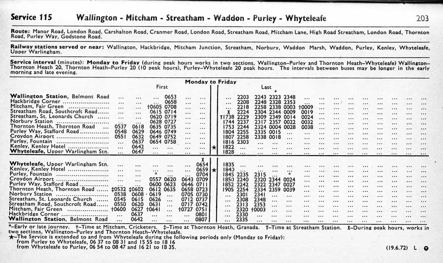 New route - replacing withdrawn northern section of Route 234 - now diverted at Wallington Station via Parkgate Road to Carshalton (Park Lane) 28.05.37 - due to the bus strike from 1st to 27th May - delaying the 115 start date until the 28th.