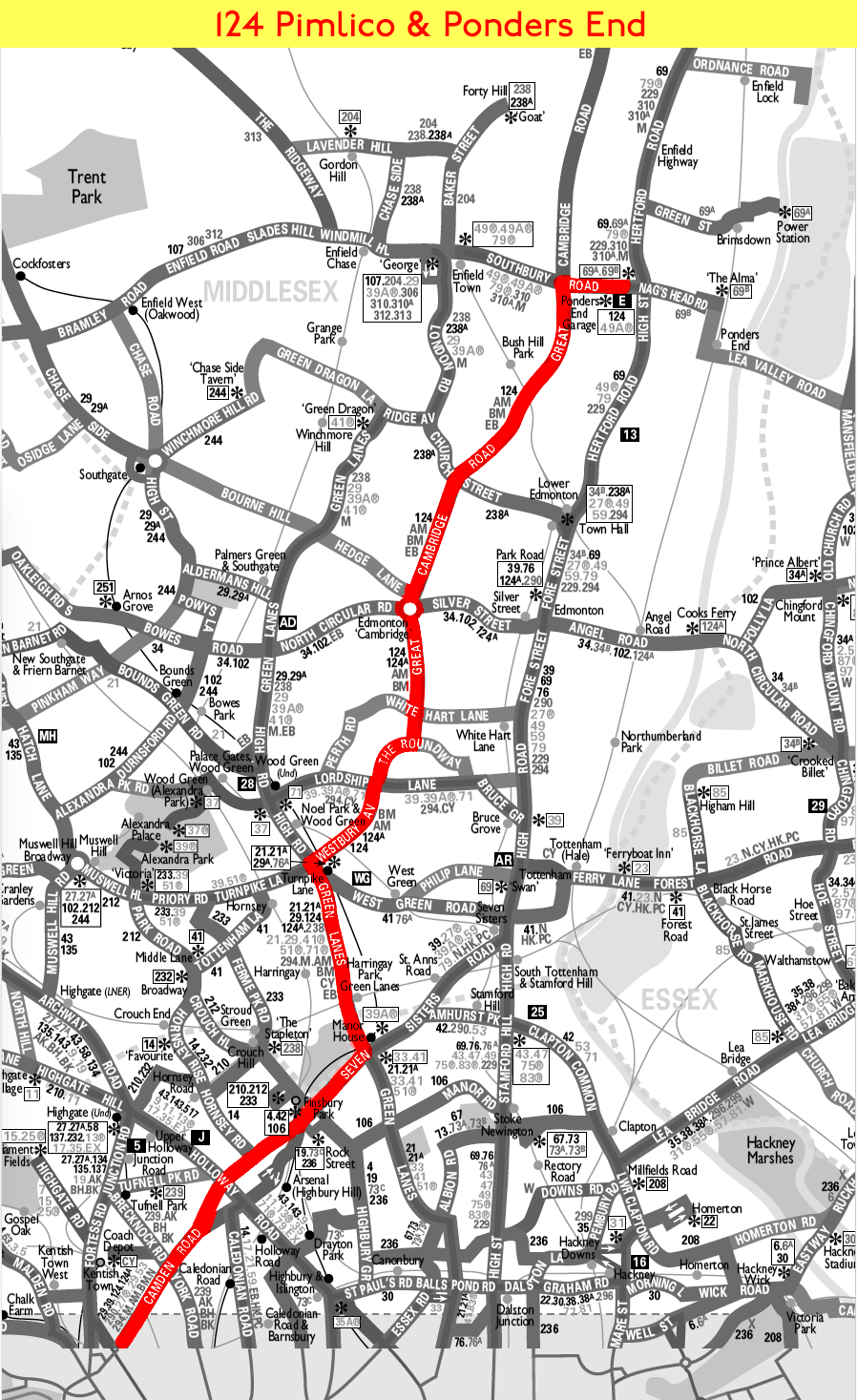 PIMLICO Grosvenor Road - Victoria - Westminster - Charing Cross Road - Tottenham Court Road - Mornington Crescent - Camden Town - Holloway - Finsbury Park - Manor House - Turnpike Lane Stn - Westbury Avenue - Great Cambridge Road - Southbury Road - PONDER END GARAGE