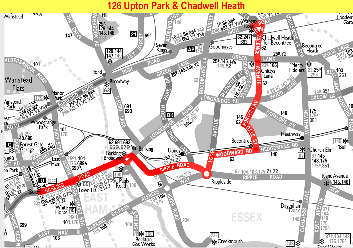 UPTON PARK Boleyn - East Ham - Barking - Ripple Road - Lodge Avenue - Woodward Road - Gale Street - Porters Avenue - Valence Avenue - CHADWELL HEATH ( Mon-Sat )