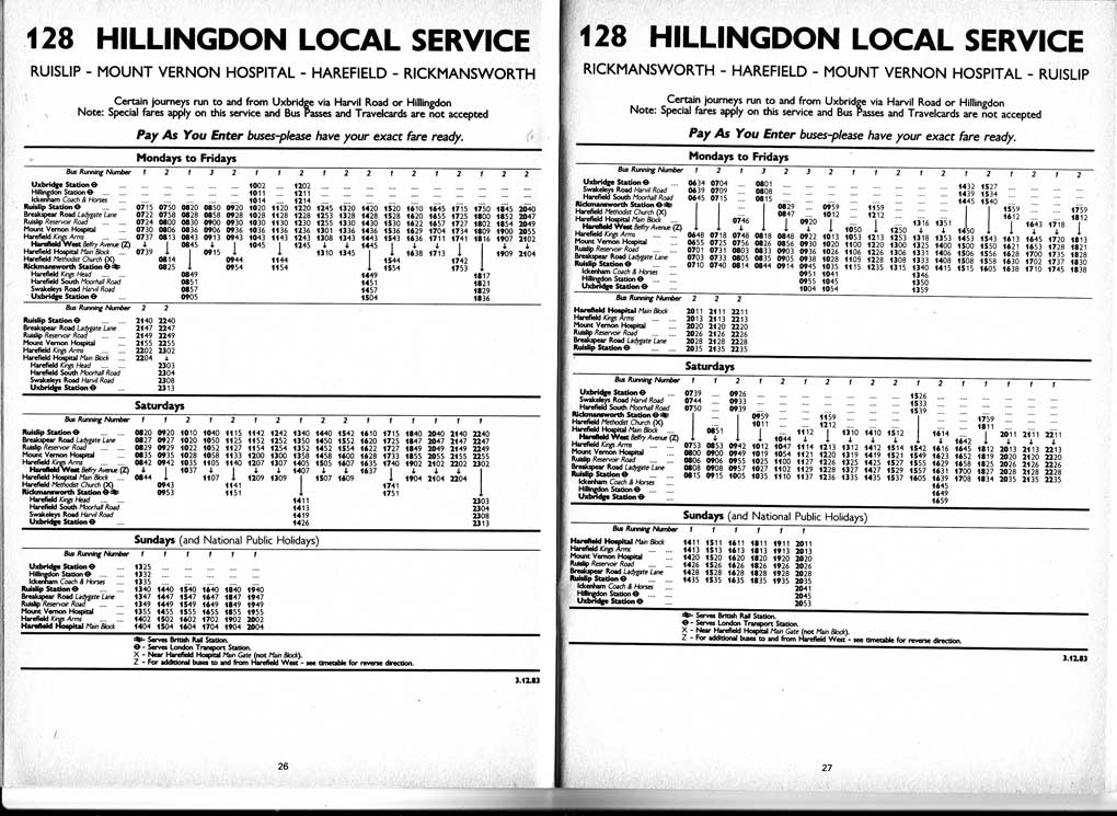 Extracted from 1986 Getting About book Note the Sunday timetable shows a meal relief was taken at Harefield Hospital |