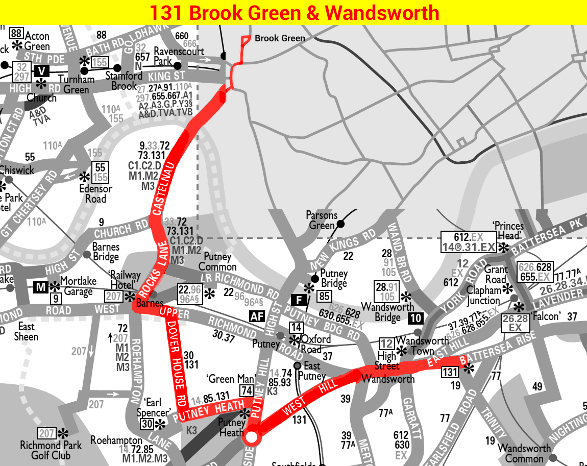 HAMMERSMITH Brook Green - Hammersmith Broadway - Castelnau - Barnes Station - Dover House Road - Roehampton - Putney Heath - West Hill - WANDSWORTH ( Daily )