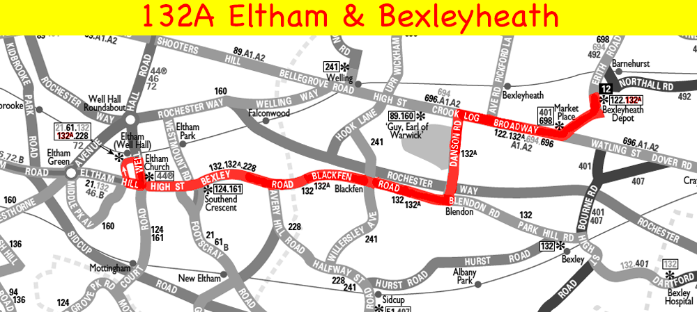 ELTHAM Well Hall Station - Eltham Church - Eltham High Street - Bexley Road - Blackfen - Blendon - Danson Road - Welling - Bexleyheath Broadway - BEXLEYHEATH TB Depot