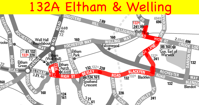 ELTHAM Well Hall Station - Eltham Church - Eltham High Street - Bexley Road - BLACKFEN ( Sat am ) - West Wood Lane - Hook Lane - Welling Corner - WELLING STATION ( Sat pm )