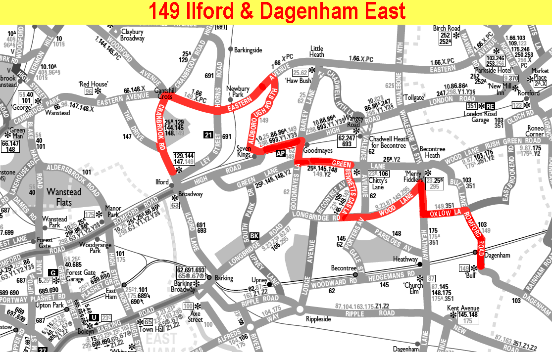 ILFORD STATION - Cranbrook Road - Gants Hill Cross- Newbury Park - Aldborough Road - Seven Kings - Goodmayes - Bennetts Castle Lane - Longbridge Road - Becontree Heath - Oxlow Lane - DAGENHAM The Bull
