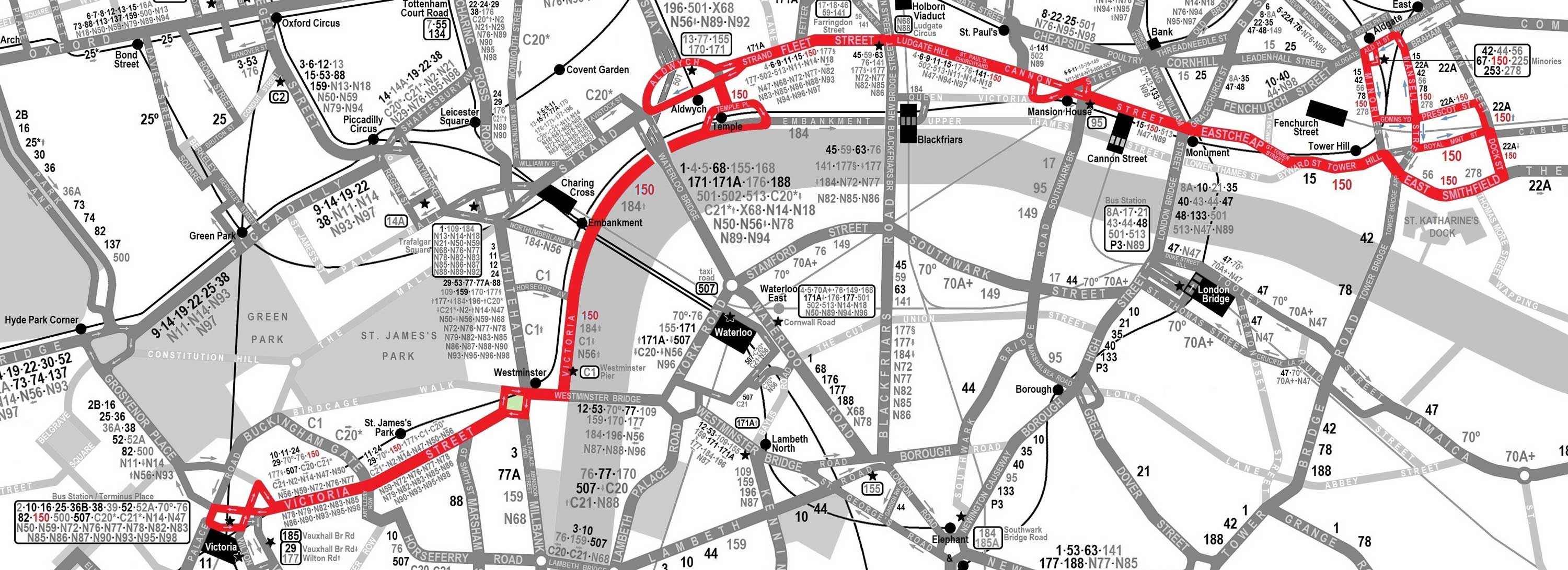 ALDGATE Bus Staton - Mansell Street - Tower of London - Cannon Street - St Pauls - Ludgate Circus - Fleet Street - Aldwych - Arundel Street - Temple Place - Victoria Embankment - Parliament Square - Victoria Street - VICTORIA BUS STATION ( Sundays only )