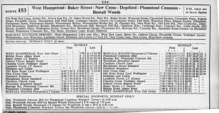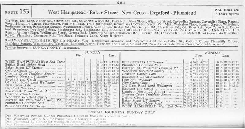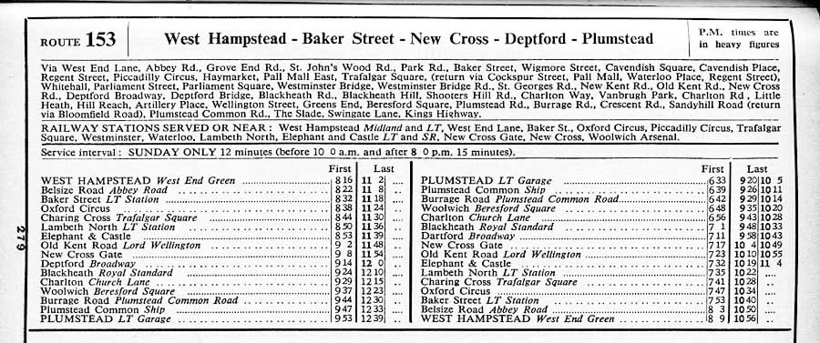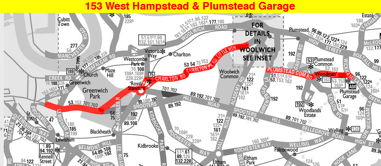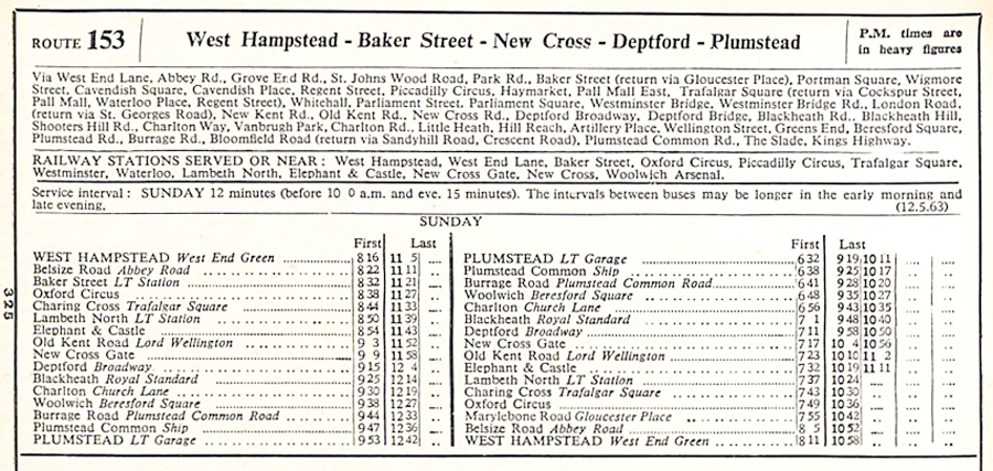 WEST HAMPSTEAD West End Green Abbey Road - St Johns Wood Road - Baker Street - Oxford Circus - Piccadilly Circus - Trafalgar Square - Westminster Bridge - Elephant - Old Kent Road' New Cross - Blackheath - Charlton Village - Woolwich - Plumstead Road - Burrage Road - Crescent Road - Sandyhill Road - ( return via Bloomfiield Road) - PLUMSTEAD COMMON ( Mon-Sat )