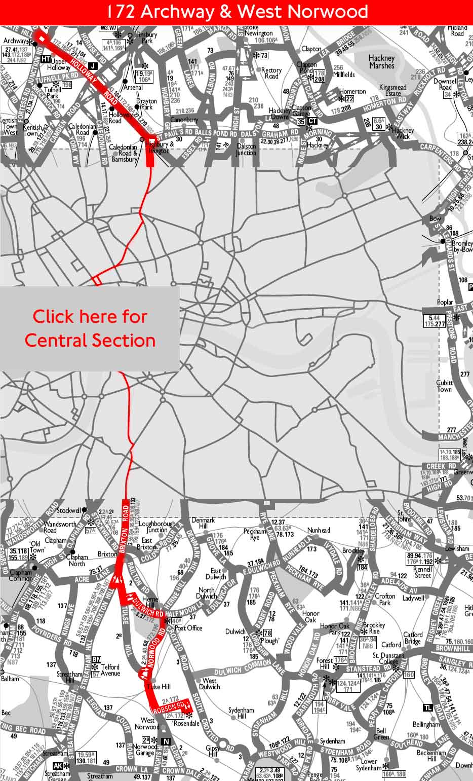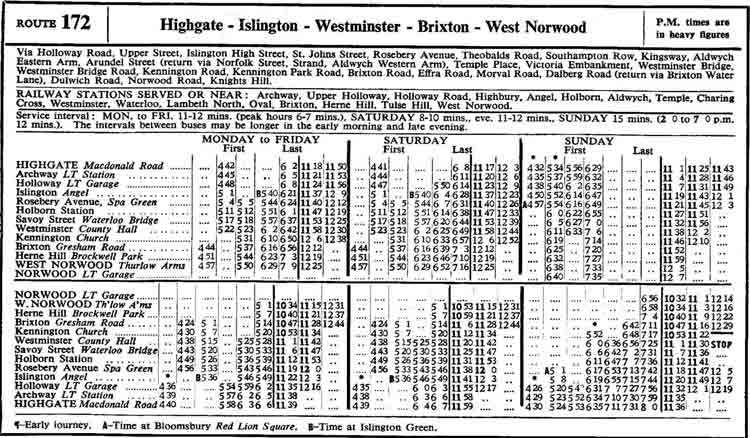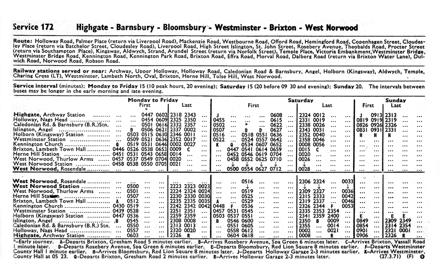 NORWOOD (Mon-Fri) - Westminster - Whitehall - TRAFALGAR SQUARE (Sats) Strand - Aldwych - BLOOMSBURY (Suns) - ARCHWAY
