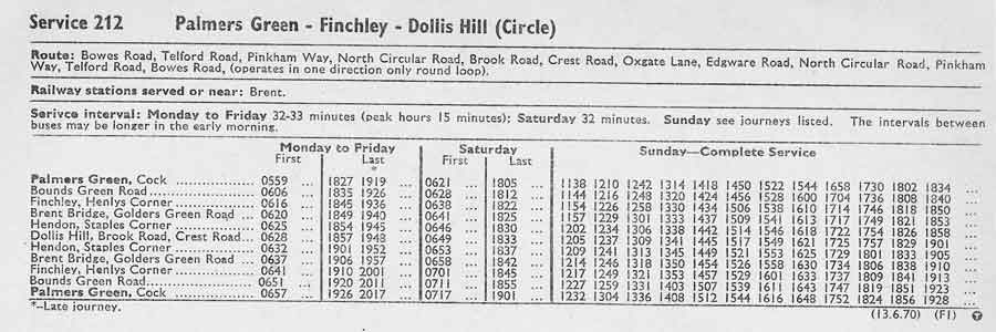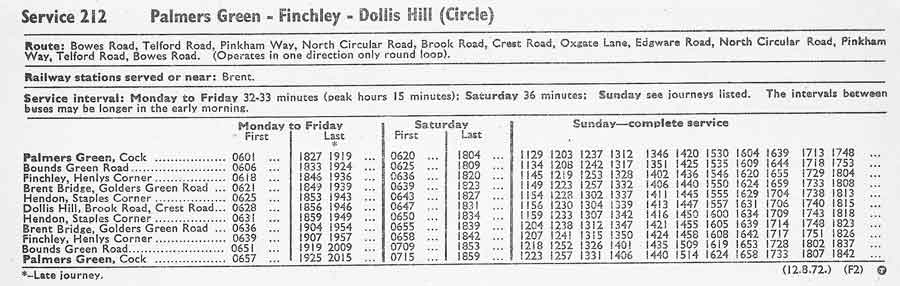 PALMERS GREEN GARAGE North Circular Road - Finchley - Staples Corner - Brook Road - DOLLIS HILL - Crest Road - Oxgate Lane - Edgware Road - Staples Corner - Finchley - PALMERS GREEN GARAGE (except evenings) circular ->operates one way around the Dollis Hill loop