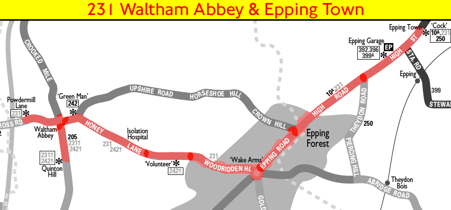 Withdrawn, replaced by Route 242 between Waltham Abbey and Wake Arms, Wake Arms to Epping Town covered by existing Route 10A